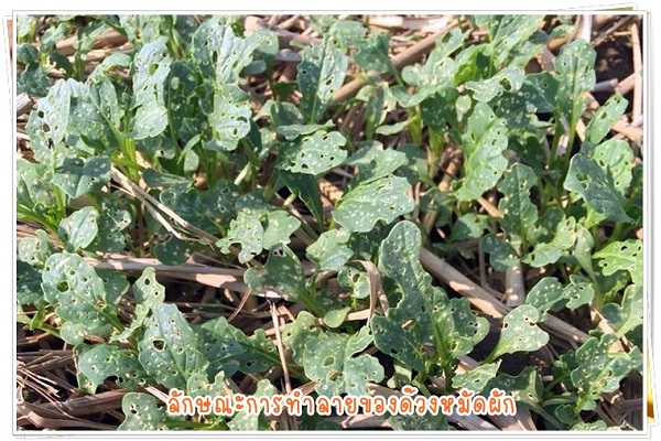 และไม่เจริญเติบโต ถ้ารากถูกทำลายมากๆ ก็อาจจะทำให้พืชผักตายได้ ตัวเต็มวัยชอบกัดผิวด้านล่างของใบทำให้ใบ