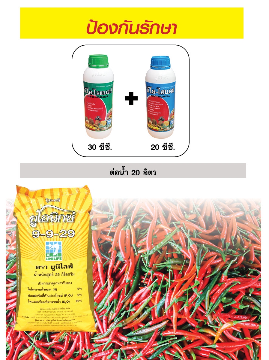 ควรการป้องกันก่อนเกิดอาการ แนะนำให้ ใช้ นีโอ-ไมเนอร์ 30 ซีซี + นีโอ-ไฮแคล 20 ซีซี ต่อน้ำ 20 ลิตร ฉีดพ่นทางใบ ทุกๆ 5-7 วันครั้ง พร้อมกับใส่ทางดิน ปุ๋ยยูโอนิกซ์ 9-9-29 ปล่อยไปกับระบบน้ำหยด 2 กก./ไร่ จะป้องกันอาการขาดธาตุอาหารของพริกได้