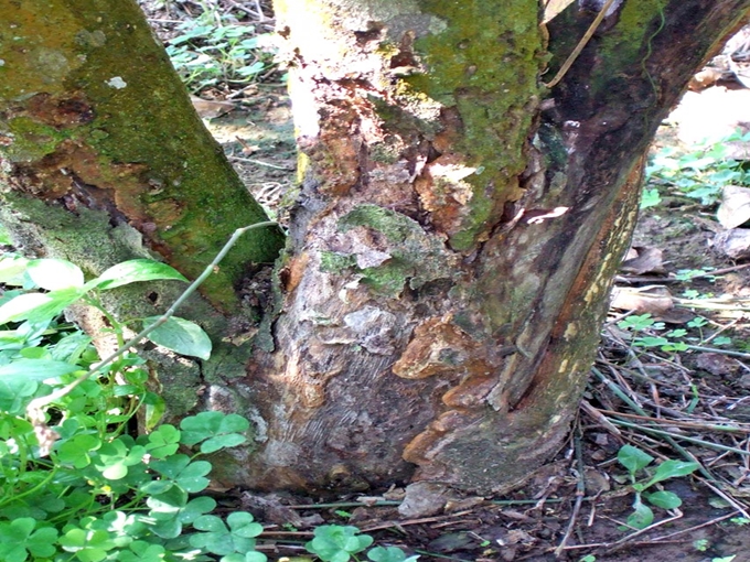 เมื่อลอกเปลือกออกจะพบเนื้อเยื่อใต้เปลือกเป็นแผลสีน้ำตาลหรือเป็นลายริ้วเน่าเยิ้มเป็นบริเวณกว้างตามลำต้น เชื้อจะลุกลามอยู่ภายใน ทำให้แผลเน่าเยิ้มขยายใหญ่ไปตามลำต้นราก รอบโคนต้น และลึกเข้าไปในท่อน้ำ ท่ออาหารต่อมาต้นทรุดโทรมเหี่ยวใบร่วงและยืนต้นตายในบางท้องที่สำหรับพืชตระกูลส้มอาจเกิดอาการรากเน่าที่รากใหญ่ รากมีสีน้ำตาล ช้ำ และเน่า แล้วขยายลุกลามมาที่ต้น อาการที่เปลือกต้นมีลักษณะเปลือกแตก มีเมือกเยิ้มออกมาจากส่วนของต้นที่แตกนั้น เมื่อถากเปลือกส่วนที่แสดงอาการ เนื้อไม้เปลี่ยนสีเป็นสีน้ำตาลแดง ส่วนมากจะพบอาการบริเวณโคนต้น ตามซอกกิ่งหรือง่ามกิ่ง หรือ กิ่งที่อยู่ต่ำๆ