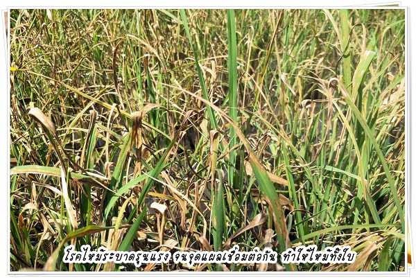 ทั่วบริเวณใบ ในกรณีที่โรครุนแรงกล้าข้าวจะแห้ง และฟุบตาย อาการคล้ายถูกไฟไหม้ (blast)