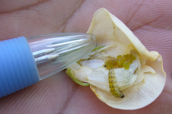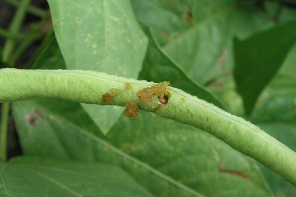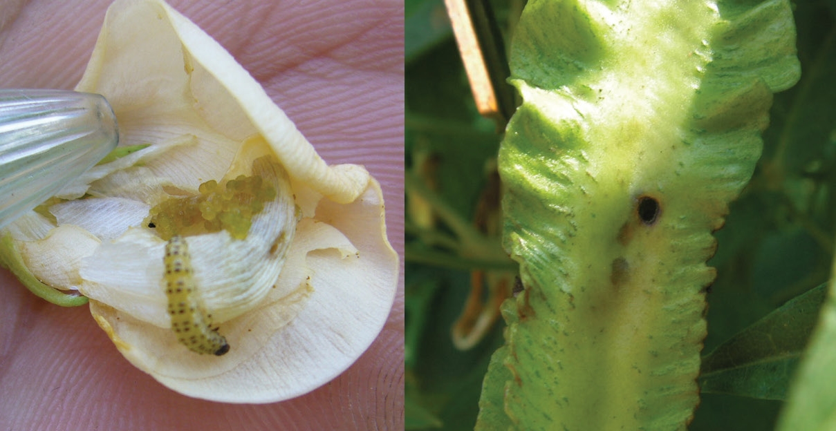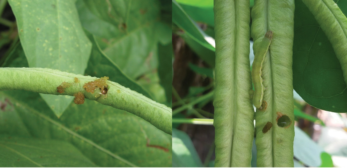 หนอนเจาะฝักถั่ว เป็นผีเสื้อกลางคืนขนาดเล็กมีแถบสีขาวคาดขวางบริเวณโคนปีกคู่หน้า เพศเมียวางไข่เป็นฟองเดี่ยวๆ บนฝักอ่อนบริเวณฐานของฝักหรือลำต้นใกล้ๆ กับฝัก เมื่อฟักออกเป็นตัวหนอนจะเจาะเข้าไปอาศัยกัดกินเมล็ดอยู่ภายในฝัก