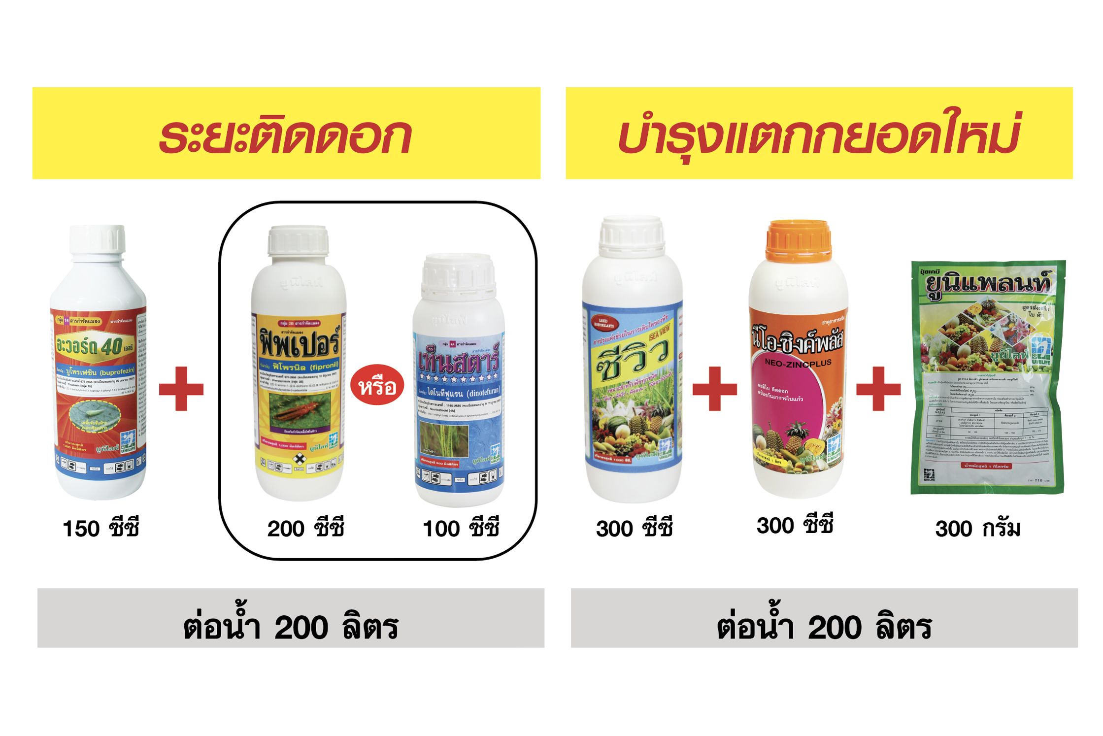 ในช่วงการระบาดรุนแรง ควรใช้หลักการป้องกันการดื้อยา พ่น 2 ครั้ง สลับกลุ่มสาร และลดอัตราการระบาดของเพลี้ยไฟโดยการรักษาความชื้นในแปลงโดยงดตัดวัชพืช