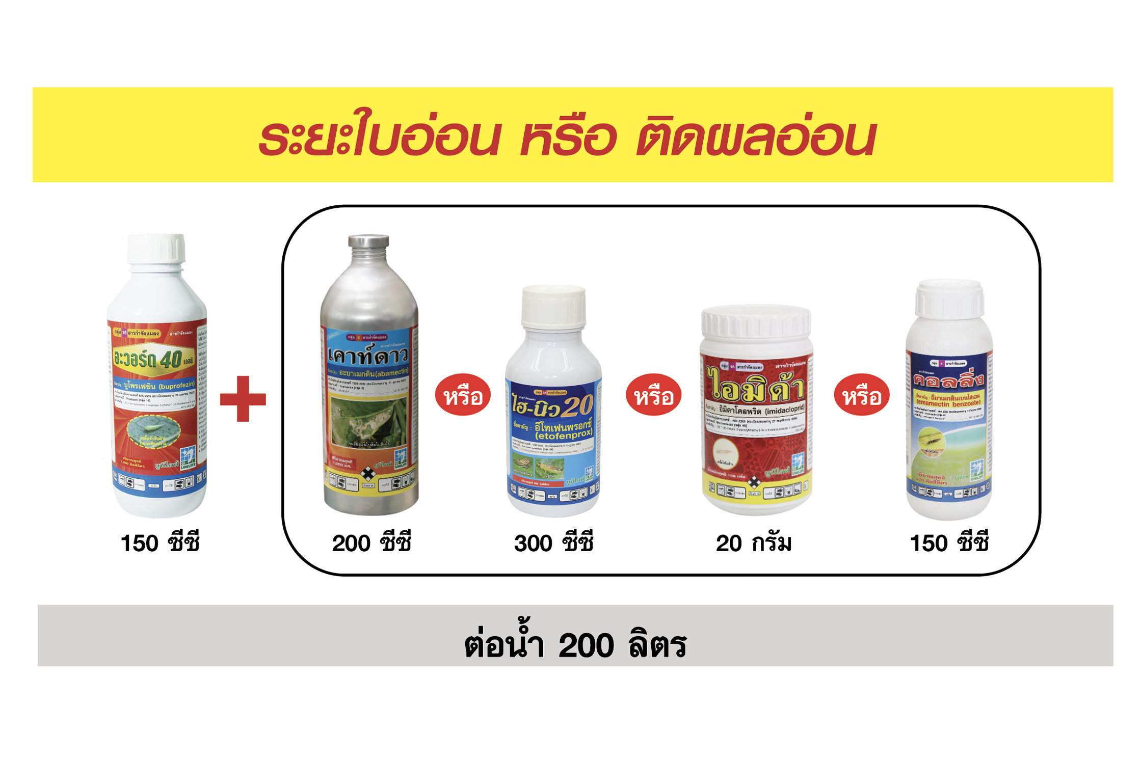 ระยะใบอ่อน หรือ ติดผลอ่อนใช้ อะวอร์ด40เอสซี ร่วมกับสารกำจัดแมลงตัวแก่ เคาท์ดาว หรือ ไฮ-นิว20 หรือ ไอมิด้า หรือ คอลลิ่ง ในกรณีที่ส้มโออยู่ในช่วงไม่มีดอก แต่ถูกทำลายจนใบม้วนงอมาก ควรตัดแต่งยอดที่ถูกทำลายใส่ถุงแล้วนำไปเผานอกแปลง เพื่อลดปริมาณแมลง แล้วบำรุงให้แตกยอดใหม่ด้วย ซีวิว + นีโอ-ซิงค์พลัส + ยูนิแพลนท์เขียว