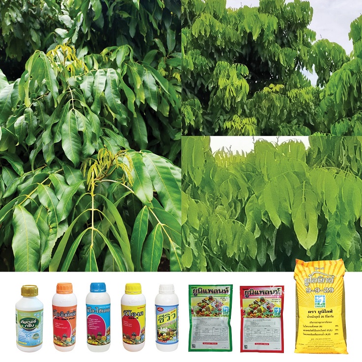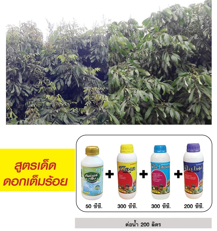 การแก้ปัญหาใบแซมดอกลำไย ต้องทำให้ลำไยออกดอกสม่ำเสมอต้องมีการเตรียมต้นลำไยให้พร้อมตั้งแต่หลังเก็บผลผลิตเลย เมื่อลำไยแทงยอดออกมาขยายใบ ด้วย การป้องกัน ใช้ คัพเวอร์กรีน 50 ซีซี + นีโอ-ซิงพลัส 300 ซีซี + นีโอ-ไฮแคล 100 ซีซี + ยูนิแพลนท์เขียว 300 กรัม + ซีวิว 250 ซีซี ต่อน้ำ 200 ลิตร เพื่อขยายขนาดใบ ใบใหญ่ เตรียมความสมบูรณ์เพื่อพร้อมในการสะสมอาหาร