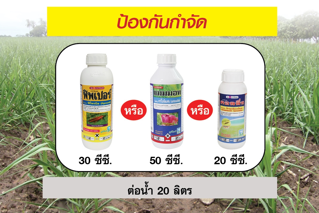 • ใช้สารเคมีกำจัดหนอนกออ้อย แนะนำผลิตภัณฑ์ ฟิพเปอร์ 30 ซีซี หรือ แมมมอท 50 ซีซี หรือ คอลลิ่ง 20 ซีซี ต่อน้ำ 20 ลิตร