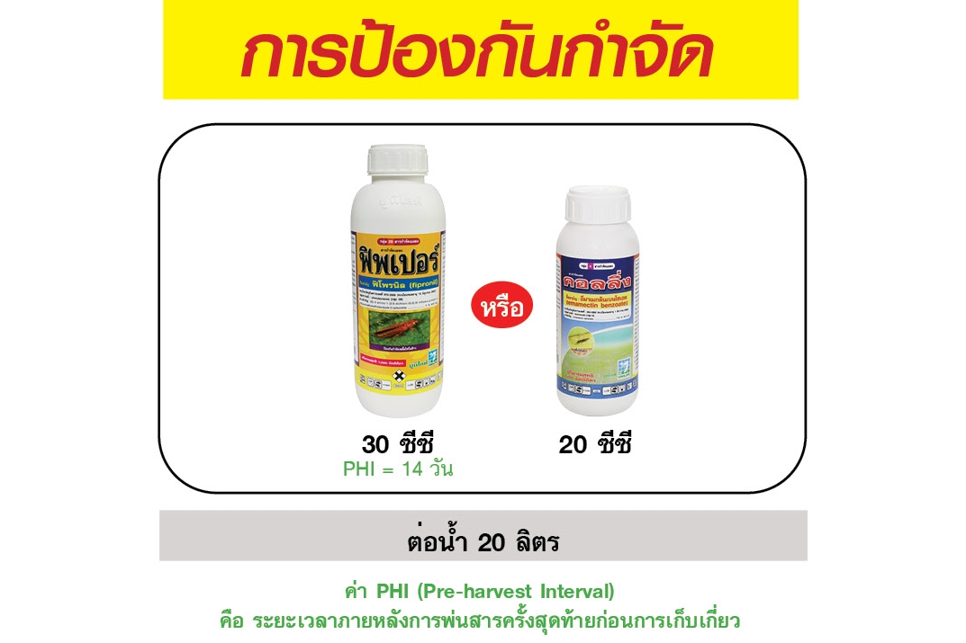 ควรป้องกันหนอนในข้าวโดยการสำรวจแปลงนาสม่ำเสมอ หากพบการระบาด ของหนอนม้วนใบข้าว แนะนำ ฟิพเปอร์ 30 ซีซี หรือ คอลลิ่ง 20 ซีซี ต่อน้ำ 20 ลิตร พ่น 1-2 ครั้งห่างกัน 5-7 วัน
