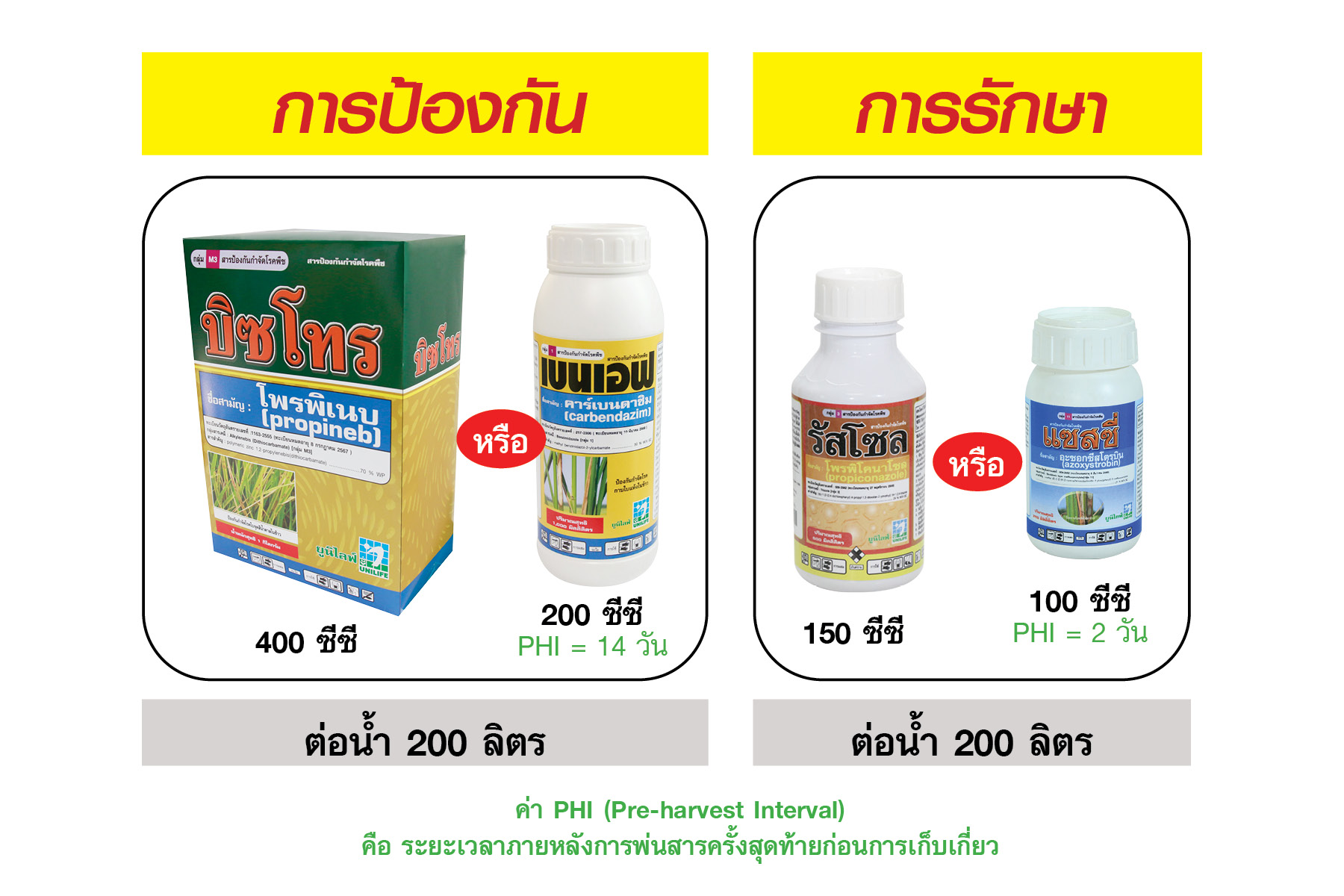 ● หากพบการระบาดของโรคหรือก่อนเก็บเกี่ยวผลผลิต แนะนำ ใช้ รัสโซล 150 ซีซี หรือ แซสซี่ 100 ซีซี ต่อน้ำ 200 ลิตร