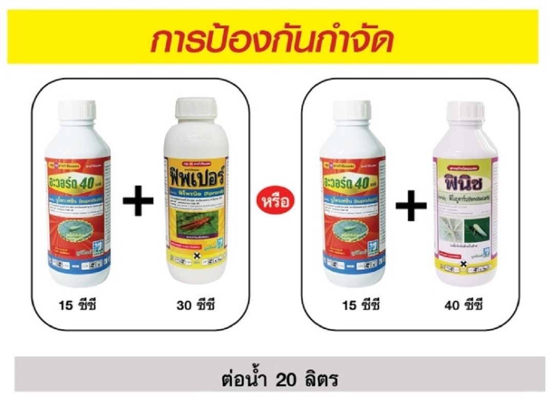 ต้องเฝ้าระวังการระบาดของแมลงพาหะทั้งสองชนิดเพลี้ยจักจั่นลายจุดสีน้ำตาล และเพลี้ยจักจั่นหลังขาว หากพบแมลงในปริมาณมาก อาจต้องตรวจสอบแปลงอ้อยให้ถี่ขึ้นและพ่นสารกำจัดด้ว อะวอร์ด40เอสซี 15 ซีซี + ฟิพเปอร์ 30 ซีซี ต่อน้ำ 20 ลิตร หรือ อะวอร์ด40เอสซี 15ซีซี+ฟินิช 40 ซีซีต่อน้ำ 20 ลิตร เมื่อพบอ้อยแสดงอาการของโรคใบขาว ให้ขุดทิ้งทำลาย เพื่อป้องกันไม่ให้เป็นแหล่งของเชื้ออยู่ในแปลง