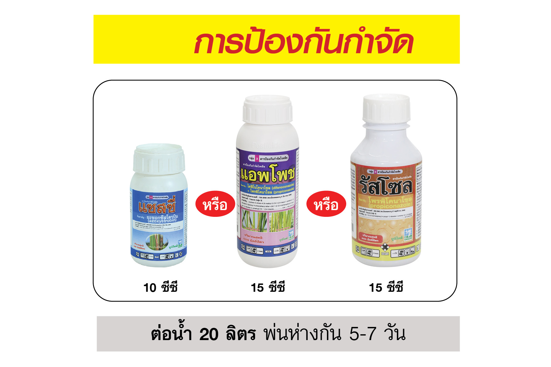 ใช้ แซสซี่ 10 ซีซี หรือ แอพโพช 15 ซีซี หรือ รัสโซล 15 ซีซี ต่อน้ำ 20 ลิตร พ่นห่างกัน 5-7 วัน