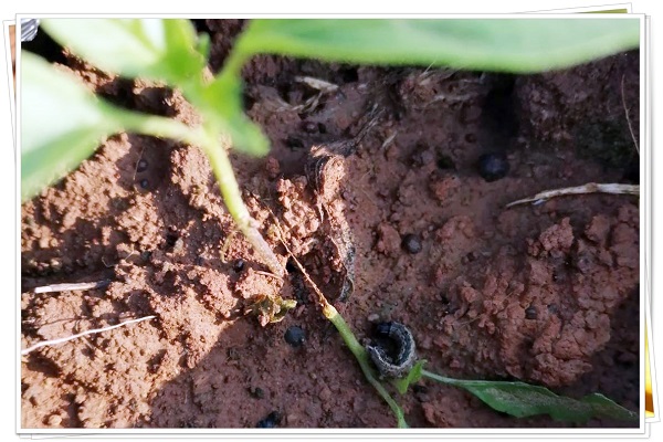เวลากลางคืนโดยจะกัดต้นกล้าอายุ 30-40 วัน ทำให้ผลผลิตเสียหายบางครั้งจะสังเกตเห็นหนอนลากเอาต้นกล้าที่กัดเ