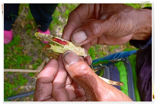 การเจาะรูของหนอน เมื่อหักกิ่งออกดูจะพบตัวหนอนกัดกินอยู่ภายในกิ่ง
