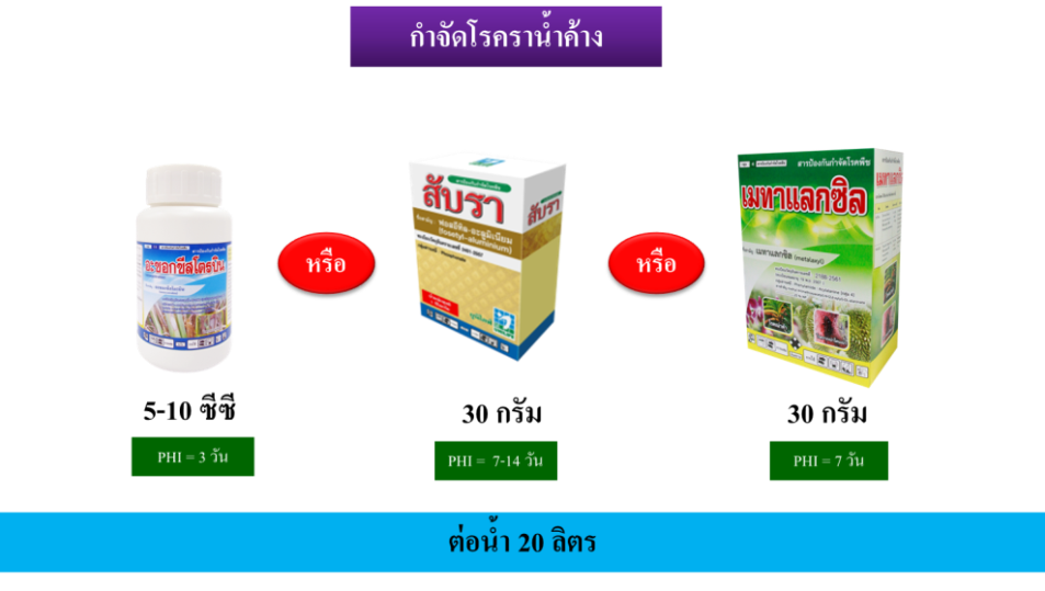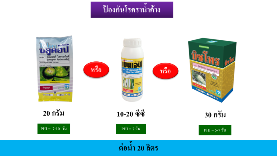 2.การป้องกันการระบาดใช้สารเคมี เช่น ไมโครบลูคอป 10-20 กรัม หรือ เบนเอฟ 10-20 ซีซี หรือ บิซโทร 40 กรัม