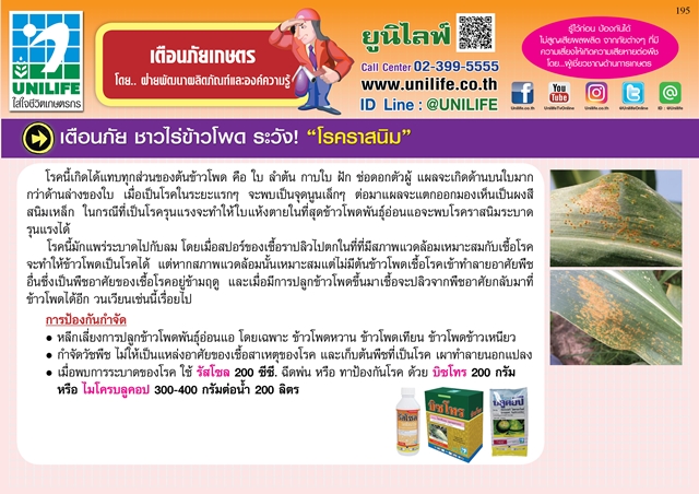- หมั่นตรวจไร่อยู่เสมอตั้งแต่ระยะกล้าเมื่อเริ่มพบโรคระบาดมีจุดสนิม 3-4 จุดต่อใบ สารที่ยูนิไลฟ์แนะนำ บิซโทร 30-40 กรัม หรือ ไมโครบลูคอป 20 กรัม หรือ รัสโซล 20 ซีซี ต่อน้ำ 20 ลิตร พ่นทุก 7 วัน จำนวน 2 ถึง 4 ครั้ง ตามความรุนแรงของโรค