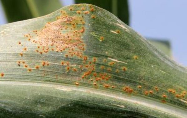 อาการของโรคจะเกิดได้แทบทุกส่วนของต้นข้าวโพด คือ ใบ ลำต้น กาบใบ ฝัก ช่อดอกตัวผู้ โดยแสดงอาการเป็นจุดนูนเล็กๆ สีน้ำตาลแดง ขนาดของแผลประมาณ 0.2-2.0 ม.ม. แผลจะเกิดด้านบนใบมากกว่าด้านล่างของใบ เมื่อเป็นโรคในระยะแรกๆ จะพบเป็นจุดนูนเล็กๆ ต่อมาแผลจะแตกออกมองเห็นเป็นผงสีสนิมเหล็กในกรณีที่เป็นโรครุนแรงจะทำให้ใบแห้งตายในที่สุด