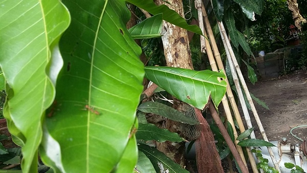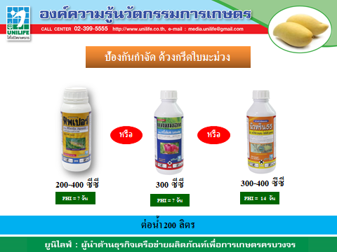 3. ในระยะมะม่วงแตกใบอ่อนจะมีแมลงทำลาย พ่นสารเคมีป้องกันกำจัด ฟิพเปอร์  20-40  ซีซี หรือ แมมมอท 50 ซีซี หรือ นิวทริน55   30-40  ซีซี ต่อน้ำ 20 ลิตร