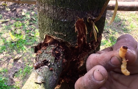 การกำจัดตัวหนอน : สำรวจหาร่องรอยการเข้าทำลายของด้วงหนวดยาว ถ้าสำรวจพบขุยไม้ละเอียดตามส่วนต่าง ๆ ของต้นทุเรียนให้ใช้มีดแคะหาตัวหนอนที่เข้าไปทำลาย และถ้าพบให้จับหนอนมาทำลาย