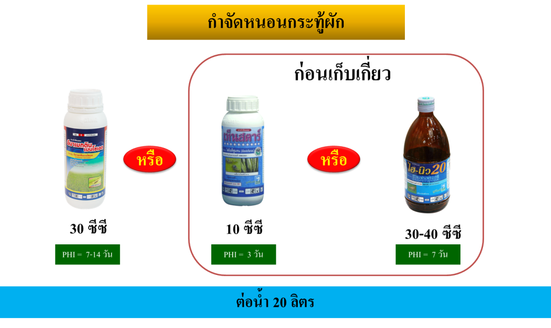 3. ผลิตภัณฑ์ที่แนะนำ อีมาเมกติน เบนโซเอต 30 ซีซี หรือ ก่อนเก็บเกี่ยว เท็นสตาร์ 20 ซีซี หรือ ไฮนิว20 30-40 ซีซี ต่อน้ำ 20 ลิตร