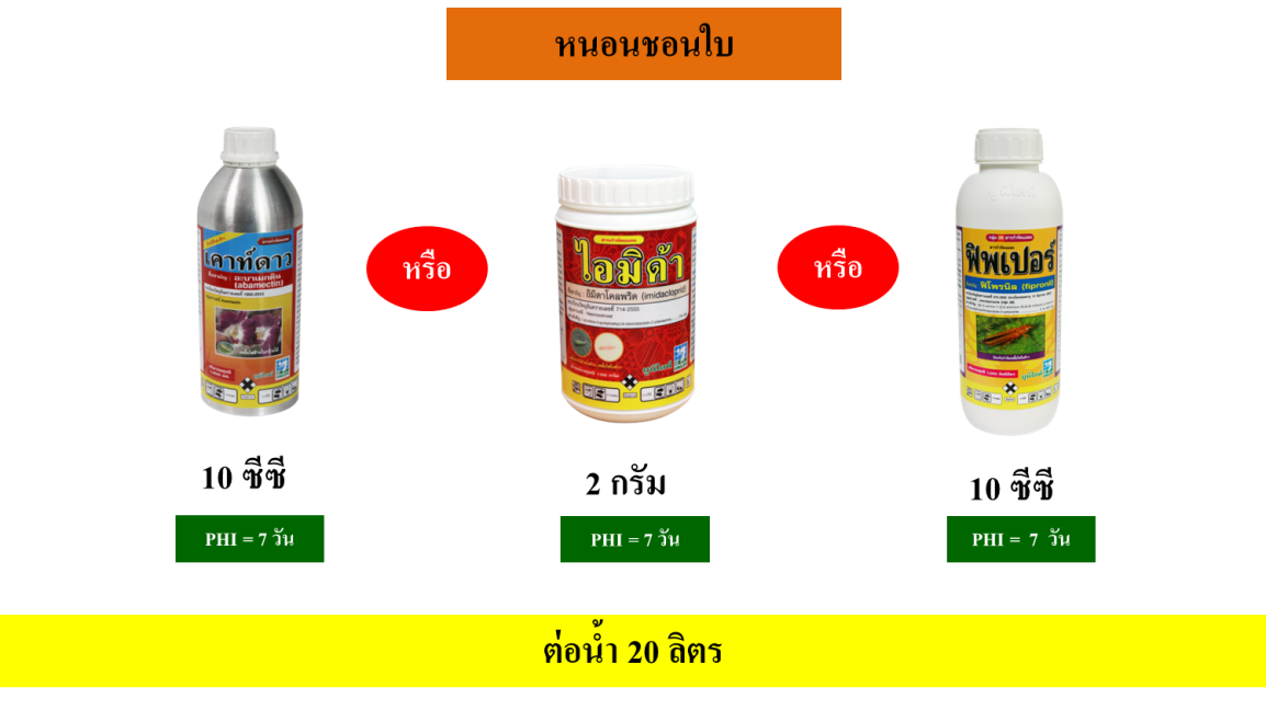 2. เกษตรกรหมั่นตรวจแปลงและสังเกตการเข้าทำลายของหนอนชอนใบอย่างสม่ำเสมอ เมื่อพบการระบาด พ่นด้วยสารฆ่าแมลง แนะนำ เคาท์ดาว 10 ซีซี หรือ ไอมิด้า 2 กรัม หรือ ฟิพเปอร์ 10 ซีซีผสมน้ำ 20 ลิตร ทุก 7 วัน จนกระทั่งใบแก่