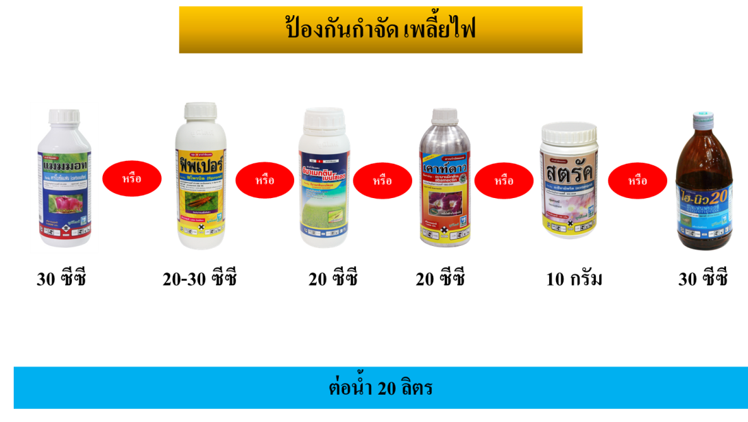 3. หากพบการระบาด สำหรับระยะก่อนให้ผลผลิต  ผลิตภัณฑ์ที่แนะนำ แมมมอท 30 ซีซี หรือ  ฟิพเปอร์ 20 ซีซี ต่อน้ำ 20 ลิตร  และควรพ่นซ้ำตามการระบาด ส่วนพริกกำลังเก็บผลผลิตให้เกษตรกรใช้ ผลิตภัณฑ์ที่แนะนำ ฟิพเปอร์ 20-30 ซีซี หรือ อีมาเมกตินเบนโซเอต 20 ซีซี หรือ เคาท์ดาว 20 ซีซี หรือ สตรัค 10 กรัม หรือ ไฮนิว 20  30 ซีซี ต่อน้ำ 20 ลิตร หรือ เท็นสตาร์ 10 ซีซี ขณะพ่นสารควรปรับหัวฉีดให้เป็นฝอยที่สุด และพ่นให้ทั่วตามส่วนต่างๆ ของพืชที่เพลี้ยไฟพริกอาศัยอยู่