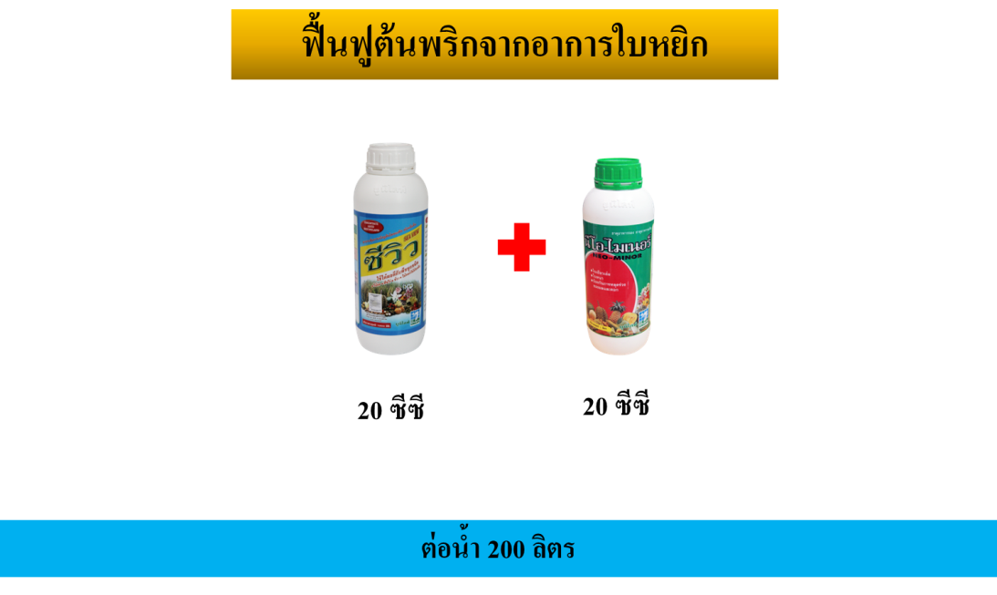 4. กรณีระบาดรุนแรงในช่วงสภาพอากาศแห้งแล้ง เกษตรกรควรพ่นปุ๋ยทางใบ เพื่อช่วยให้ต้นพริกฟื้นตัวจากอาการใบหงิกได้ดีและเร็วยิ่งขึ้น ผลิตภัณฑ์ที่แนะนำ ซีวิว 30 ซีซี + นีโอ-ไมเนอร์ 30 ซีซี ผสมน้ำ 20 ลิตร