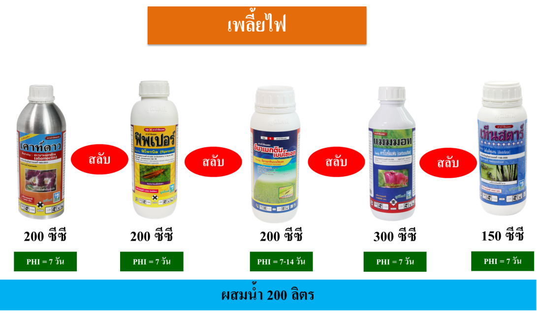 3. ผลิตภัณฑ์ที่แนะนำ เคาท์ดาว  200  ซีซี สลับ อีมาเมกติน เบนโซเอต 200 ซีซี สลับ ฟิพเปอร์  200  ซีซี สลับ แมมมอท  300  ซีซี สลับ เท็นสตาร์ 150  ซีซี  ต่อน้ำ  200  ลิตร