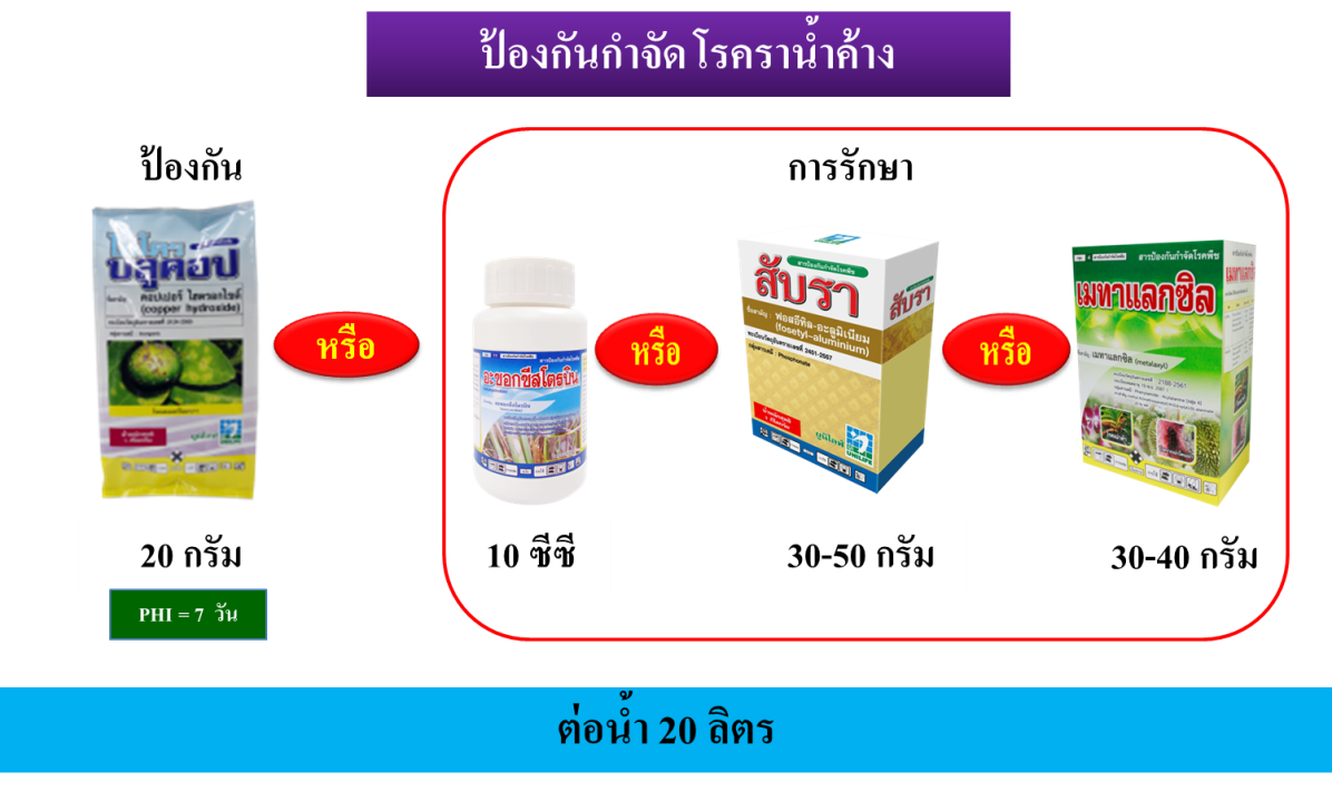 4. ป้องกันการเกิดโรคราน้ำค้างด้วย ไมโครบูลคอป 20 กรัม ต่อน้ำ 20 ลิตร หากพบการระบาดรักษาด้วย อะซอกซีสโตรบิน 10 ซีซี หรือ สับรา 30-50 กรัม หรือ เมทาแลกซิล 30-40 กรัม ต่อน้ำ 20 ลิตร ฉีดพ่น 7-10 วันครั้ง