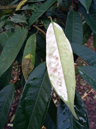 หากเกิดที่ใบจะมีคราบฝุ่นสีขาวเกิดขึ้น เป็นมากจะหนาเป็นปื้น ทำให้ใบร่วงหล่นหากเกิดที่ระยะช่อดอกและผลอ่อนจะปรากฏกลุ่มเชื้อราสีขาวมีลักษณะคล้ายฝุ่นแป้งปกคลุมกลีบดอกและผลอ่อนทำให้แลดูขาวโพลนต่อมาดอกและผลอ่อนจะร่วง ผลที่เป็นไม่มากนักหรือผลมีขนาดค่อนข้างโตเท่ากำปั้นผลอาจเจริญเติบโตต่อไปได้ แต่ผิวเปลือกจะมีลักษณะด้าน ๆไม่สวยและมีหนามทู่กว่าปกติผลทุเรียนที่มีเชื้อราเจริญที่ผิวเป็นระยะเวลานานอาจมีผลทำให้รสชาติทุเรียนเปลี่ยนแปลง ทำให้ทุเรียนเปลือกหนาผิวผลหยาบกร้านภายหลังการฉีดพ่นสารเคมี