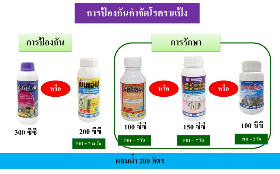 การรักษา  รัสโซล 100 ซีซี หรือ ไดฟีโนโคนาโซล + โพรพิโคนาโซล 150 ซีซี  หรือ อะซอกซิสโตรบิน 100 ซีซี ต่อน้ำ 200 ลิตร พ่นห่างกัน 7-10 วัน