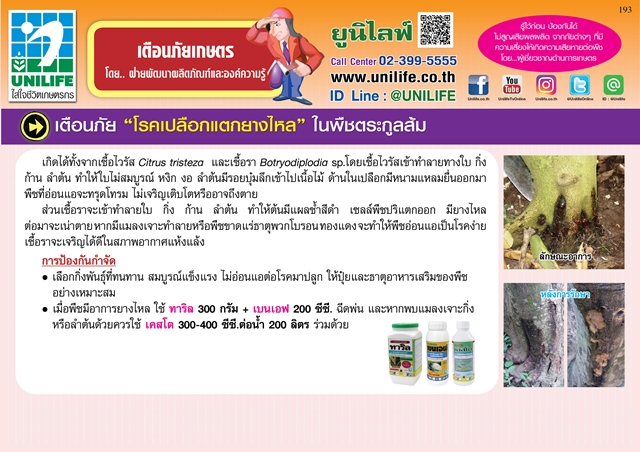 โรคยางไหลที่ยูนิไลฟ์แนะนำ เมื่อพบแมลงเจาะกิ่งลำต้น ใช้ ทาริล 300 ซีซี บวก เคสโต 300-400 ซีซี บวก เบนเอฟ 200 ซีซี ต่อน้ำ 200 ลิตร