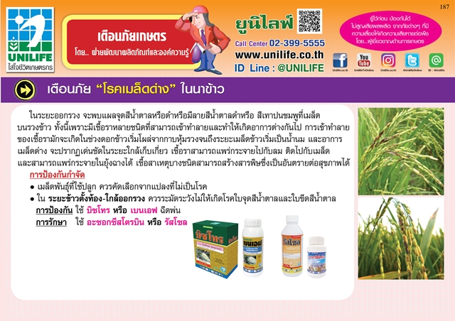 • ถ้าพบการระบาดของโรคใบจุดสีน้ำตาล และใบขีดสีน้ำตาล ในระยะต้นข้าวตั้งท้องใกล้ออกรวง สารที่ยูนิไลฟ์แนะนำให้ฉีดพ่น  ด้วยสารป้องกัน กำจัดเชื้อรา เช่น การป้องกันให้เลือกใช้ บิซโทร 300-400 กรัม หรือ เบนเอฟ 200 ซีซี  ต่อน้ำ 200 ลิตร ต่อพื้นที่ 5 ไร่ และ การรักษาให้เลือกใช้ อะซอกซีสโตรบิน 100-200 ซีซี  หรือ รัสโซล 200 ซีซี ต่อน้ำ  200 ลิตร ต่อพื้นที่ 5 ไร่