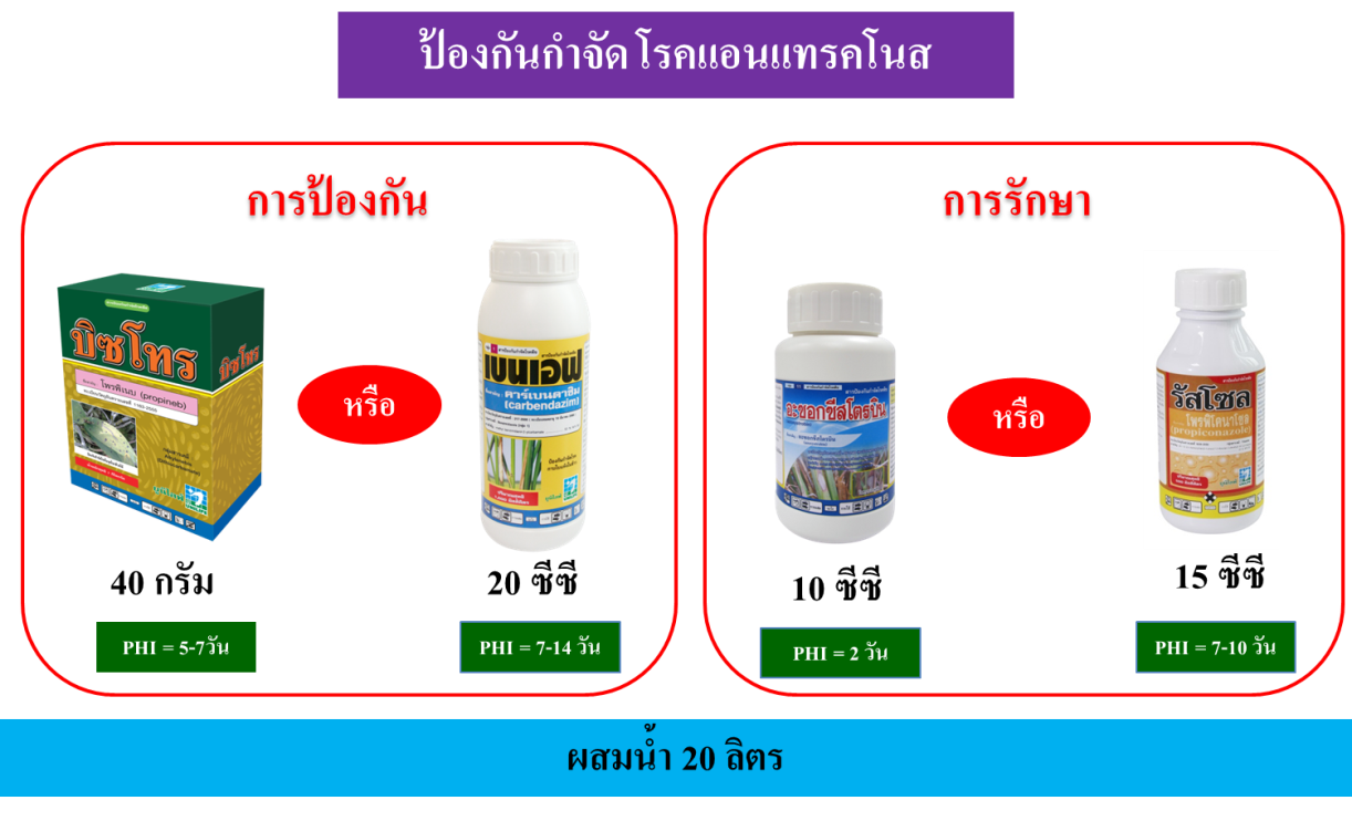 • – โดยฉีดพ่นสารป้องกันก่อนเปิดตาดอกด้วย บิซโทร 40 กรัม หรือ เบนเอฟ 20 ซีซี ต่อน้ำ 20 ลิตร หากพบการระบาดรักษาด้วย อะซอกซิสโตรบิน 10 ซีซี หรือ รัสโซล 15 ซีซี ต่อน้ำ 20 ลิตร ควรพ่น 2 ครั้งห่างกัน 5-7 วัน