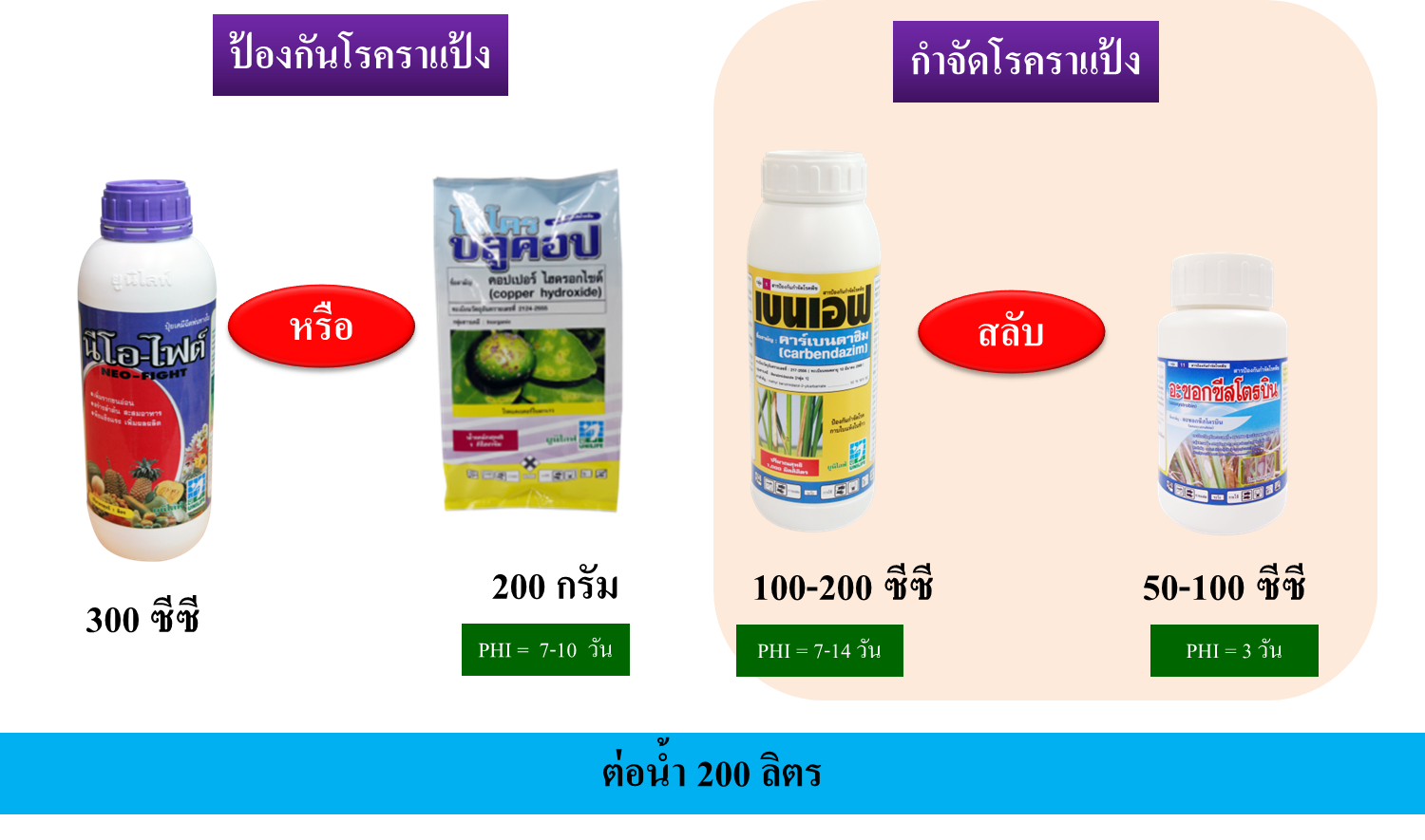2. ป้องกันการเกิดโรคราแป้งด้วย นีโอ-ไฟต์ อัตรา 300 ซีซี หรือ ไมโครบลูคอป 200 กรัม  ต่อน้ำ 200 ลิตร เมื่อปรากฏมีโรคเกิดขึ้นให้ใช้สารเคมีป้องกันกำจัด เบนเอฟ 100-200 ซีซี สลับ อะซอกซิสโตรบิน 50-100 ซีซี ต่อน้ำ 200 ลิตร