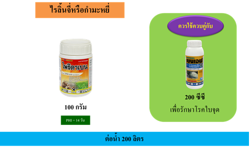 ไพริดาเบน 100 กรัม บวก เบนเอฟ 200 ซีซี ต่อน้ำ 200 ลิตร  โดยพ่นให้ทั่วทั้งหน้าใบและหลังใบ