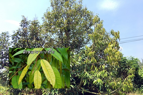 ใบทุเรียนจะไม่เป็นมันสดเหมือนใบทุเรียนปกติ ต่อมาใบล่างๆ จะเริ่มเป็นจุดประเหลือง กลายเป็นสีเหลืองซีดในที่สุด แล้วค่อยๆ หลุดร่วงไป ต้นทรุดโทรมแล้วตาย