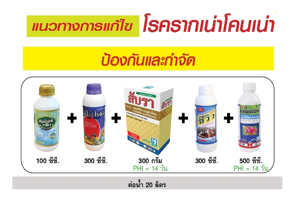 2.ฟื้นฟูระบบราก เพื่อรักษาและกำจัดเชื้อราในดิน พร้อมกระตุ้นการสร้างรากใหม่ด้วย ยูโอนิกซ์ 300 ซีซี + นีโอ-ไฟต์ 300 ซีซี + เมทาแลกซิล 300 กรัม ต่อน้ำ  200  ลิตร ฉีดพ่นลงดินบริเวณรอบชายพุ่มและโคนต้นให้เปียกโชก ทำ 2-3 ครั้งห่างกัน 10-15 วัน ทำจนกว่าทุเรียนจะมีรากใหม่