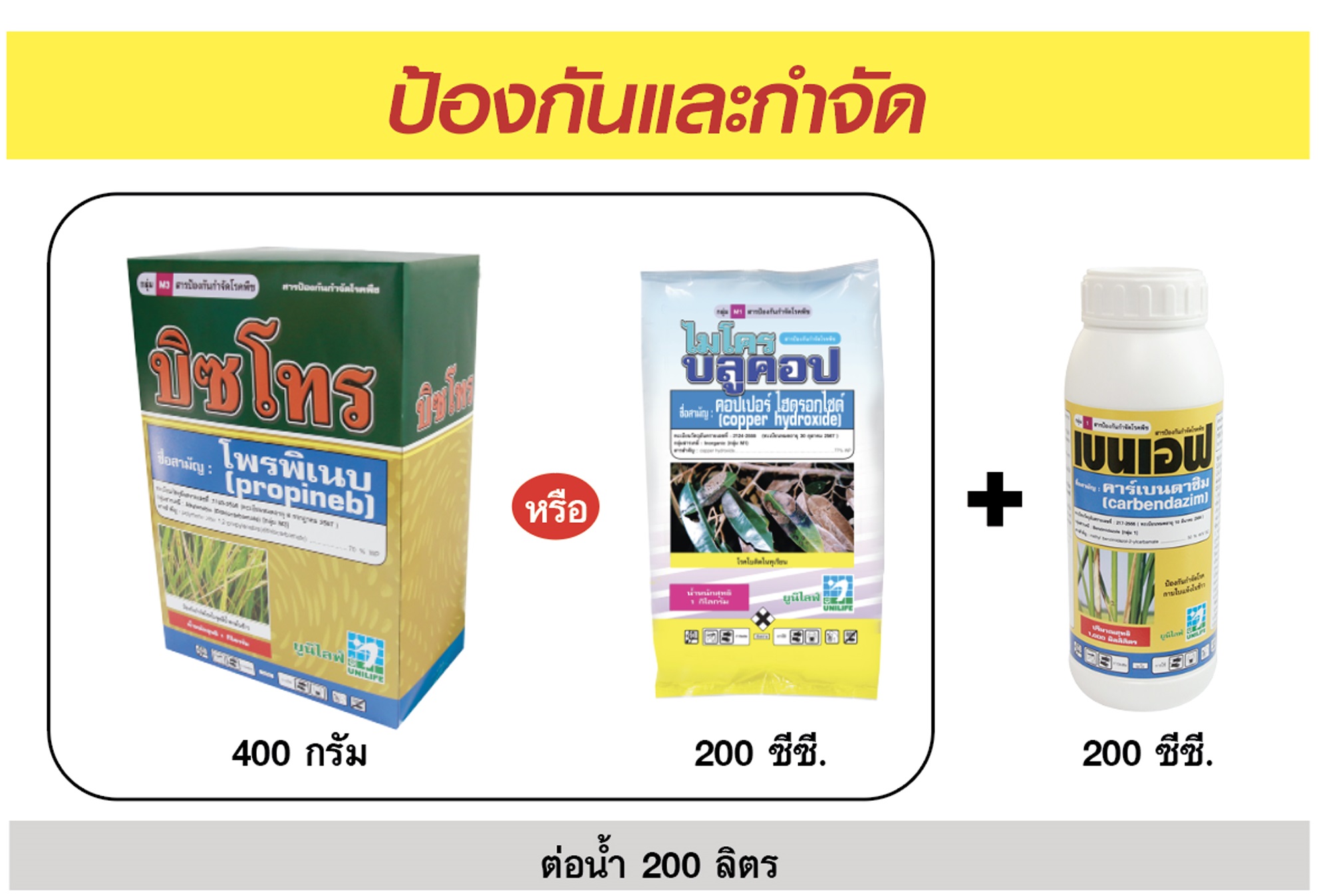 3. ใช้สารป้องกันกำจัดโรคพืช แนะนำผลิตภัณฑ์ บิซโทร 400 กรัม หรือ ไมโครบลูคอป 200 กรัม ร่วมกับ  เบนเอฟ
