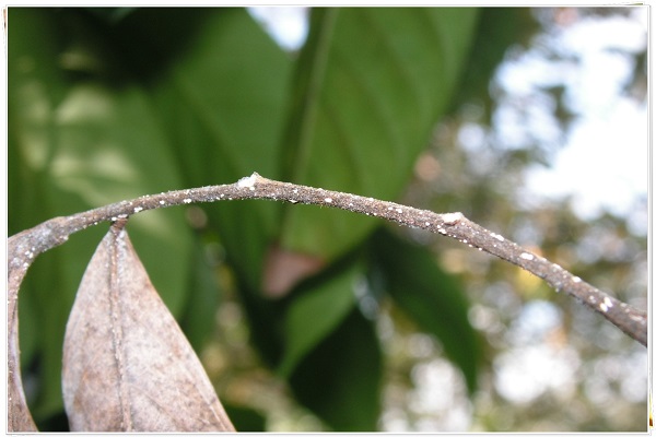 พบราสีขาว สีชมพูขึ้นบนกิ่ง ให้เกษตรกรตัดกิ่งที่เป็นโรค เก็บเศษซากพืชส่วนที่เป็นโรค และกำจัดวัชพืชในแปลงปลูก
