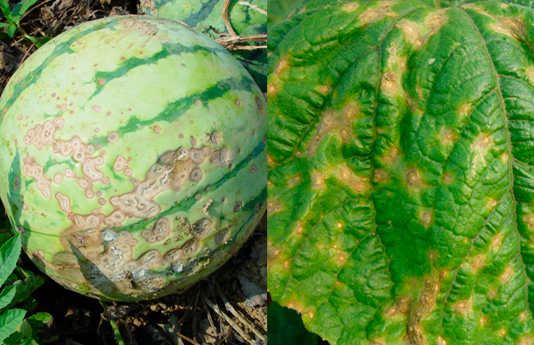 4.พืชตระกูลแตง : อาการแรกๆใบจะเป็นจุดเหลืองเล็กๆ หรือจุดฉ่ำน้ำ และขยายใหญ่รวดเร็ว เปลี่ยนเป็นสีน้ำตาลเข้มถึงดำ ใบร่วงได้ อาการบนผลเริ่มแรกเป็นจุดฉ่ำน้ำ ต่อมาแผลแห้งเป็นสีน้ำตาลหรือดำ เห็นเป็นวงซ้อนกัน