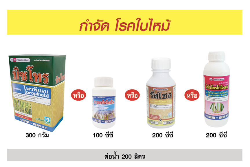4. ฉีดพ่นสารป้องกันกำจัด ใช้ บิซโทร 300 กรัม หรือ อะซอกซีสโตรบิน 100 ซีซี หรือ รัสโซล 200 ซีซี