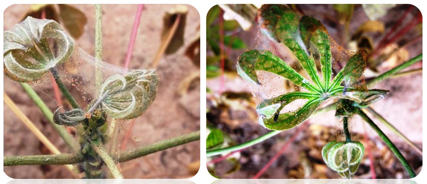 ไรแดงมันสำปะหลัง ตัวอ่อนมี 6 ขา ตัวกลมใส ตัวเต็มวัยมีสีแดงเข้ม มี 8 ขา กว้าง 0.4  มิลลิเมตร ยาวประมาณ 0.5 มิลลิเมตร ส่วนขาไม่มีสี อยู่รวมกันเป็นกลุ่ม ไรแดงมันสำปะหลังจะดูดกินน้ำเลี้ยงบนหลังใบของส่วนยอดและขยายปริมาณลงสู่ใบส่วนล่าง ทำให้ตาลีบ ใบเหลืองซีด ม้วนงอ และร่วง ทำให้ต้นแคระแกรนและอาจตายได้ในที่สุด ระบาดรุนแรงในสภาพอากาศแห้งแล้ง หรือฝนทิ้งช่วงเป็นเวลานาน